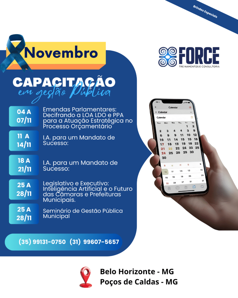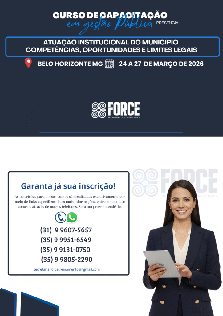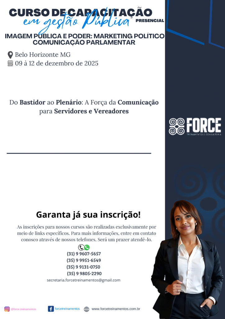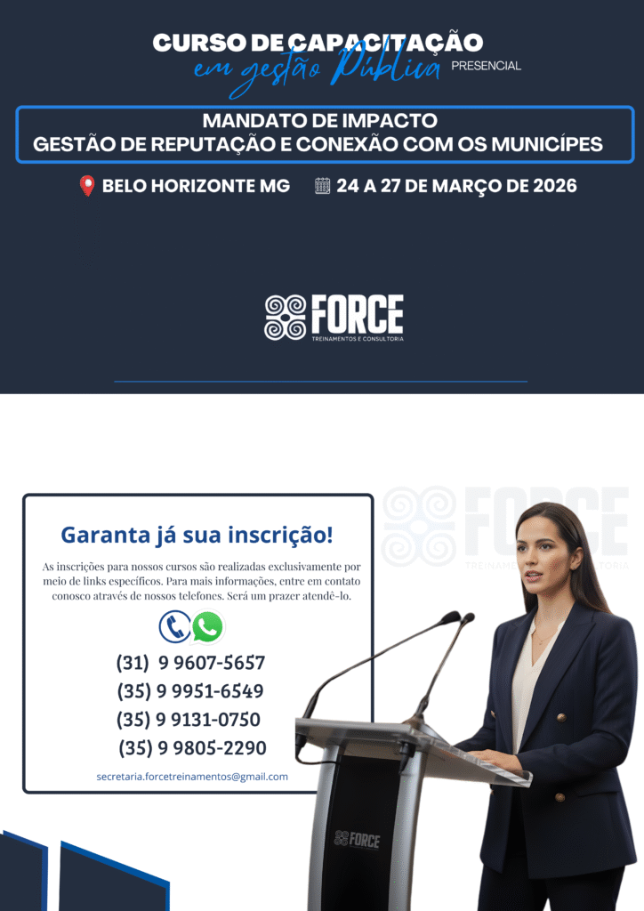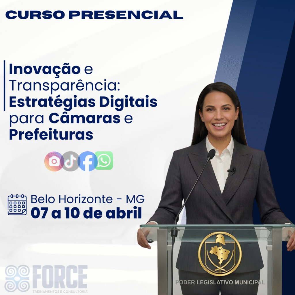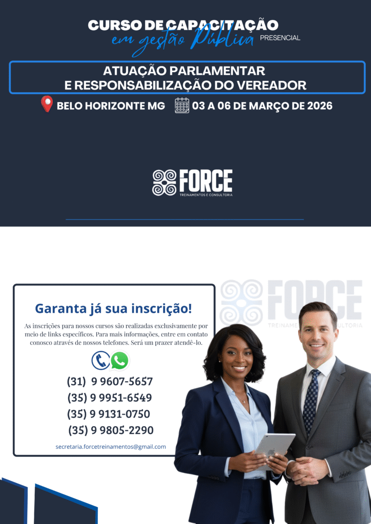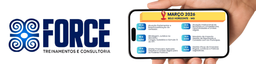 A Force Treinamentos e Consultoria é um Instituto especializado na capacitação de agentes públicos, servidores e assessores. Atuamos em todo o Brasil, com foco em cursos práticos e atualizados, especialmente voltados para Câmaras Municipais e Prefeituras, contribuindo para uma gestão pública mais eficiente e comprometida com resultados.