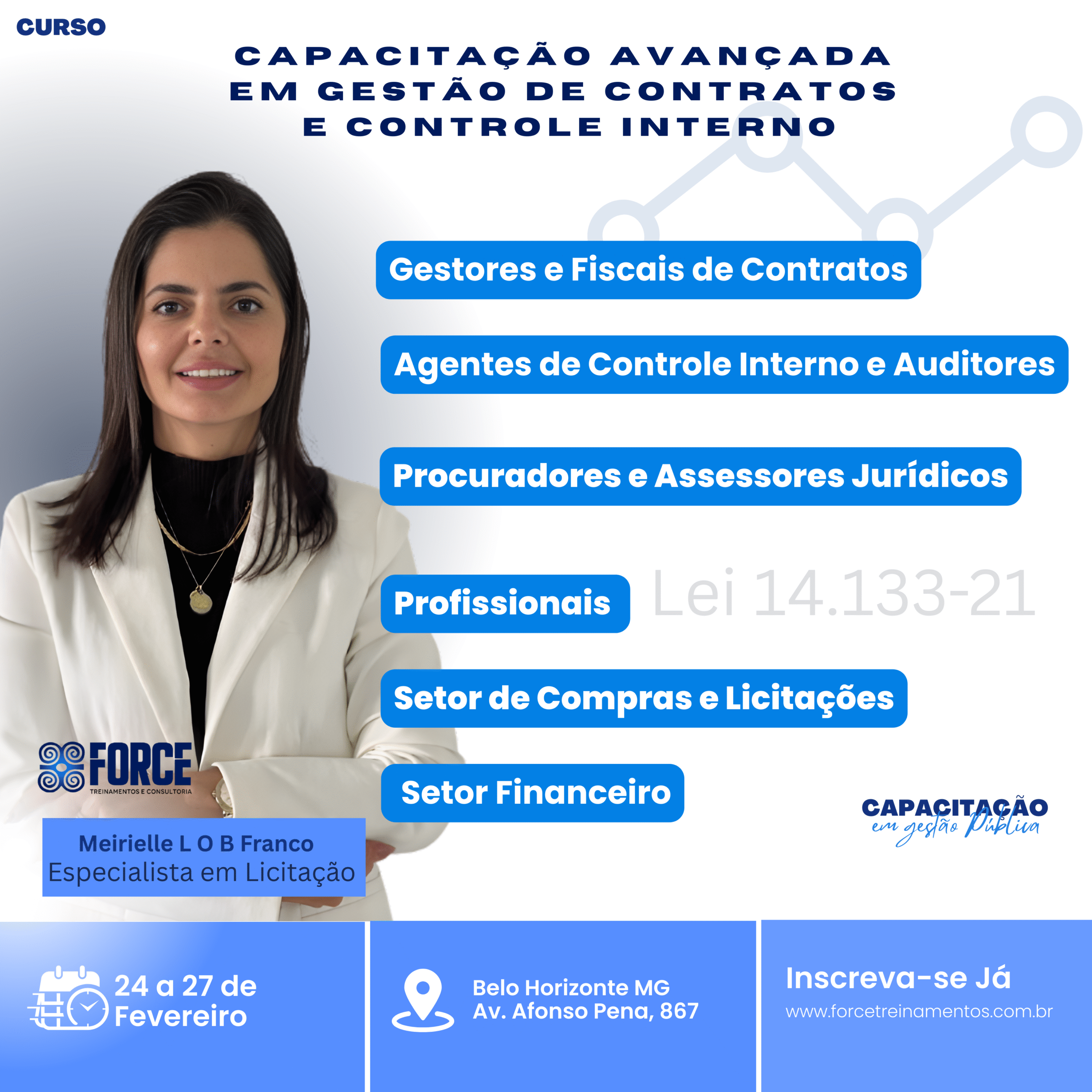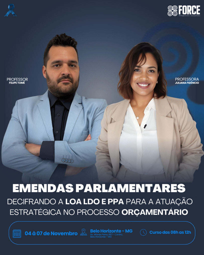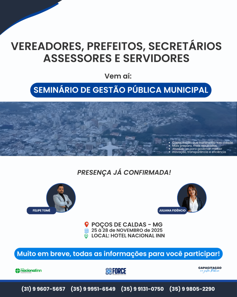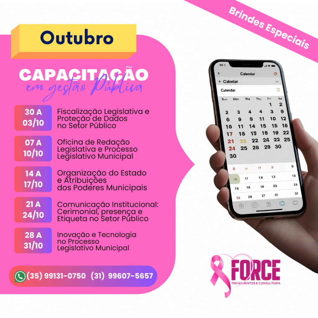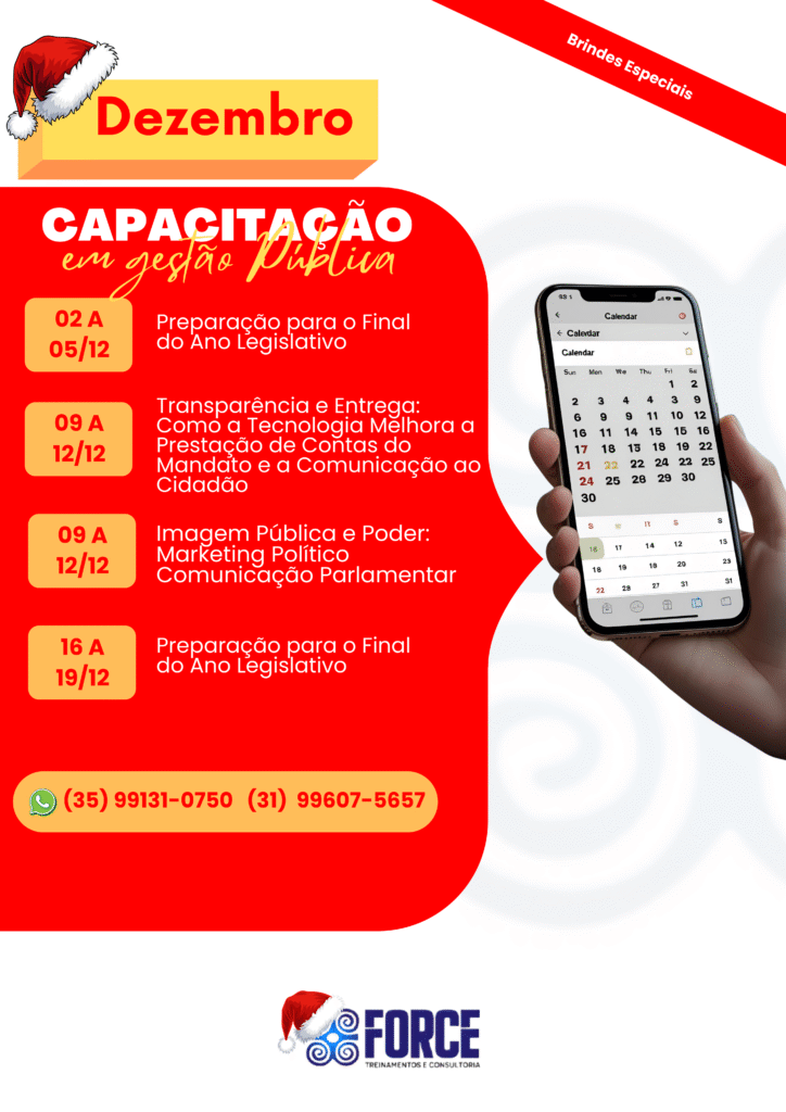 A Force Treinamentos e Consultoria é um Instituto especializado na capacitação de agentes públicos, servidores e assessores. Atuamos em todo o Brasil, com foco em cursos práticos e atualizados, especialmente voltados para Câmaras Municipais e Prefeituras, contribuindo para uma gestão pública mais eficiente e comprometida com resultados.