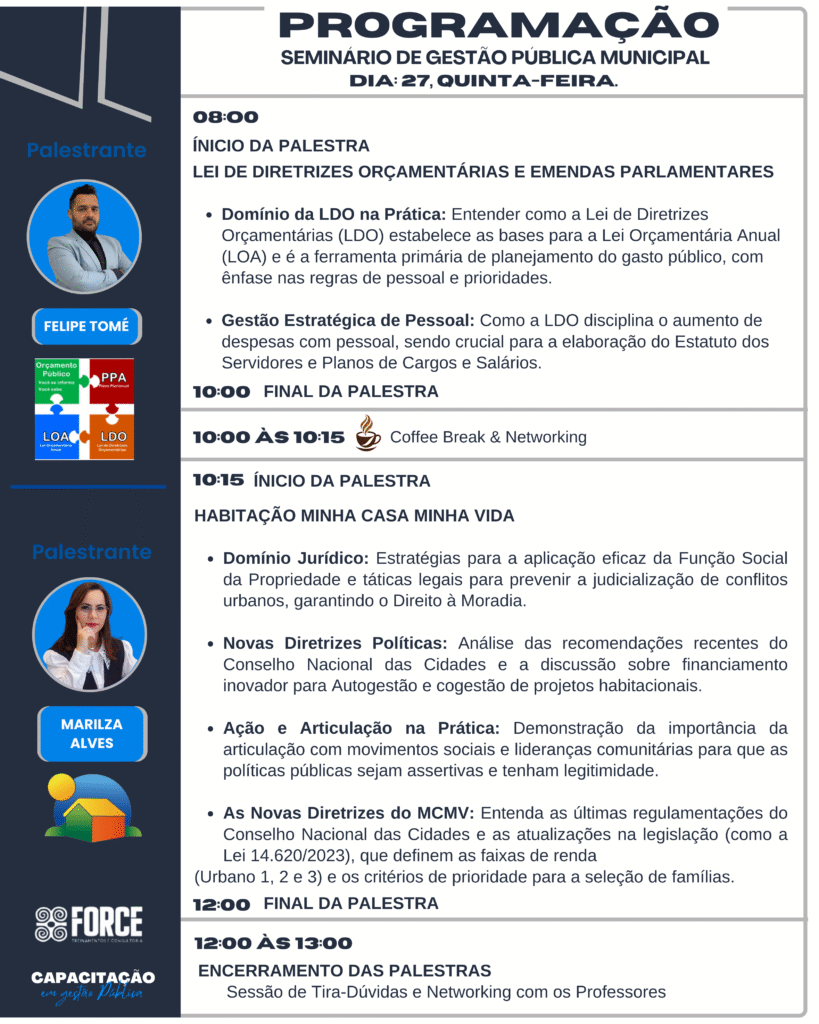 • Gestão Estratégica de Pessoal: Como a LDO disciplina o aumento de despesas com pessoal, sendo crucial para a elaboração do Estatuto dos Servidores e Planos de Cargos e Salários. PALESTRANTE Felipe Tomé Mota e Silva
