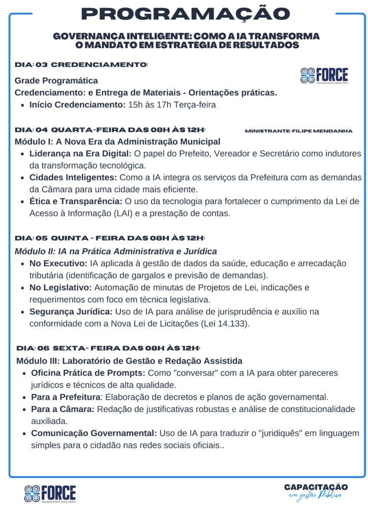 Capacitar servidores dos poderes Executivo e Legislativo para compreenderem as estruturas administrativas, os procedimentos fundamentais da gestão pública e aprimorarem a comunicação e cooperação entre os entes municipais, promovendo uma atuação mais eficiente, ética e integrada.