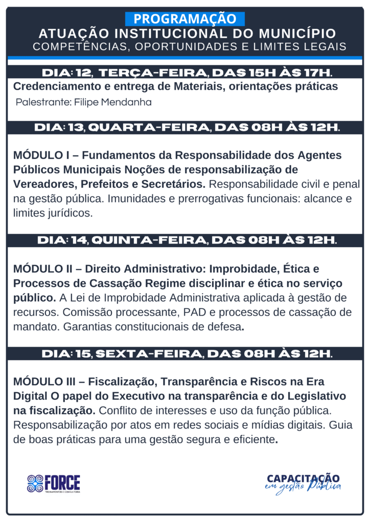 MÓDULO I – Fundamentos da Responsabilidade dos Agentes Públicos Municipais Noções de responsabilização de Vereadores, Prefeitos e Secretários. Responsabilidade civil e penal na gestão pública. Imunidades e prerrogativas funcionais: alcance e limites jurídicos.